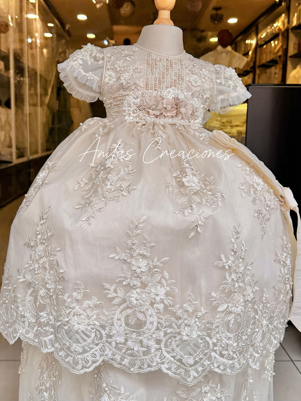Hermoso Vestido de primera comunion con tela de tull bordado de algodón con manga abierta 3/4 con broche de flores hechas artesanalmente una por una. Completamente forrado para el cuidado de la piel de su nena.